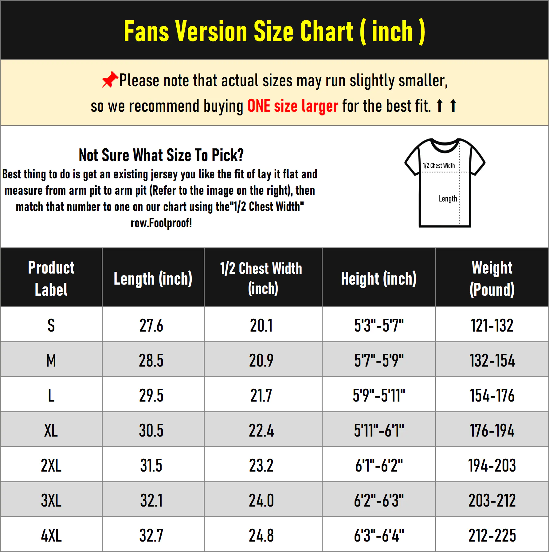 Please note that due to measurement errors, there may be a 1-2 inch discrepancy between the actual jersey size and the size chart, which is considered normal. If your measurements fall between two sizes or if you are overweight or have a muscular build, we highly recommend purchasing a larger size to ensure a more comfortable fit and better wearing experience.